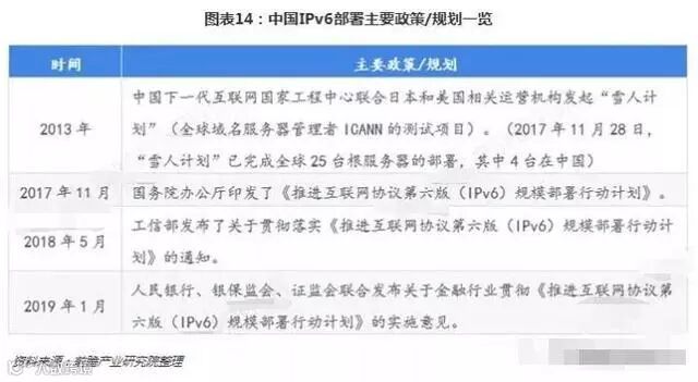 而中国IPv6的部署之所以能够快速推进,与国家的政策导向密切相关。事实上,中国之所以可以在IPv6跟服务器的建设上领跑全球,与我国2013年参与的“雪人计划”计划密切相关。此外,企业在国家出台相应政策以后,进行了积极部署,例如,在2018年5月,工信部发布了关于贯彻落实《推进互联网协议第六版(IPv6)规模部署行动计划》的通知以后,在2018年7月,三大运营商就相继公布了IPv6在网络基础设施、终端、自营应用、门户网站和手机营业厅等方面的改造及部署计划,从而进一步加快了IPv6的建设进程。
