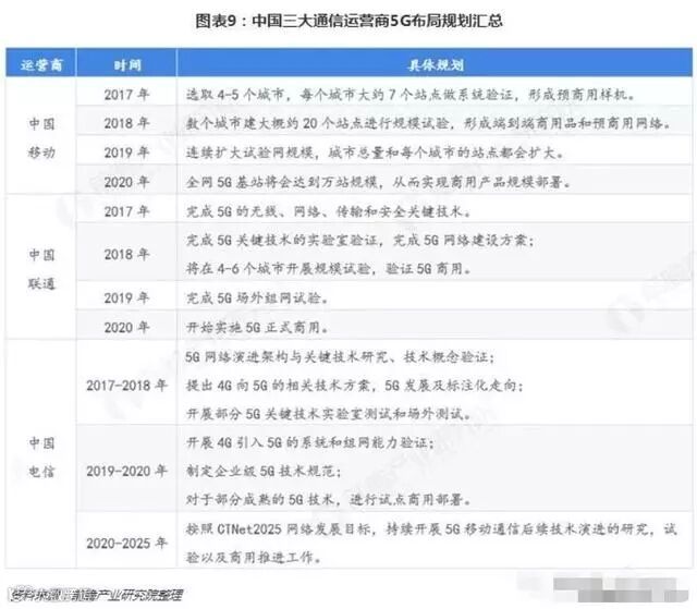 此外,尽管目前产业内竞争主体较多,但是多数竞争企业均还处于投资布局、规划建设以及试点阶段,并未形成正面的产品市场份额竞争。以我国三大通信运营商为例,三大运营商均明确颁布了针对5G网络发展的详细规划,并均提出2018年要在国内多个城市进行试点,并在2020年前后正式推进5G网络商用的普及工作。