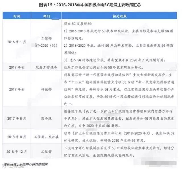 因此,对于5G整个产业的发展来说,国家政策的支持也至关重要。事实上,我国政府一直在积极推动5G建设。早在2013年,工信部、发改委和科技部率先成立5G推动组IMT-2020(5G)推进组,主要推动中国第五代移动通信技术研究和开展国际交流与合作。近两年,更是密集出台相关政策,持续强化中国5G布局。自2018年以来,发改委发文降低涵盖5G全部频段的频段占用费,持续推动5G网络部署和商用;同时,工信部和发改委印发《扩大和升级信息消费三年行动计划(2018-2020年)》,提出加快光纤及4G网络覆盖,确保2020年5G商用。