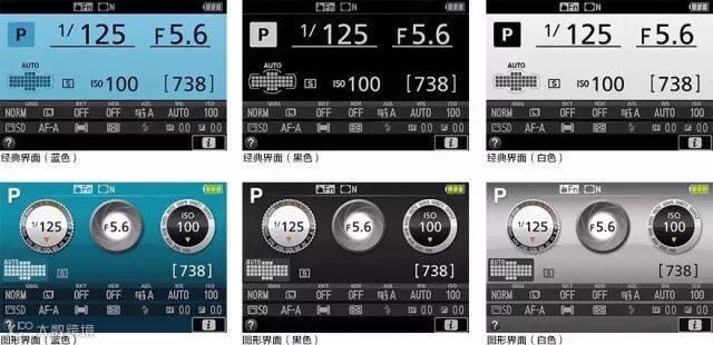 取景器拍摄时,可按下信息按钮确认设置。D5600触摸操控的信息显示有经典和图形两种设计以及黑、蓝、白三种颜色。在图形界面上,光圈的变更以图像形式显示,十分直观易操作。