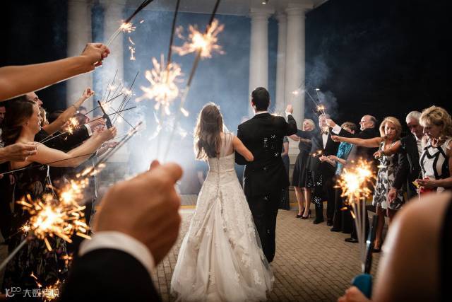 大光圈,前景虚化构图,这张在婚礼上拍摄的照片使用f/2.2光圈,利用新郎的胳膊和礼花来衬托新娘。