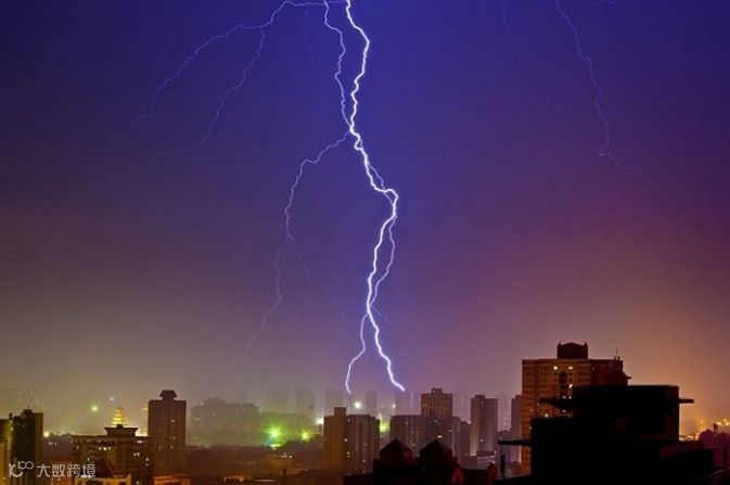 在这张照片里,摄影师很巧妙的捕捉到了闪电,天空的蓝色和城市灯光所晕染出的紫色给照片蒙上了一种怪异的感觉。