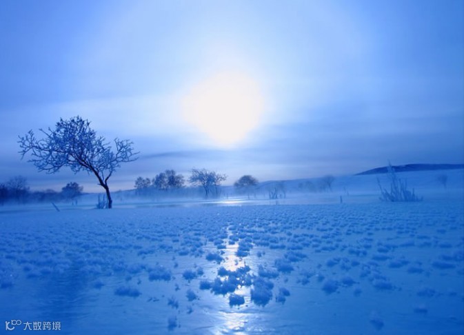 摄影师的这幅风景作品以出色的冷调蓝色而成功。照片中的每一处都透露着冬季、和平、安静的意味。早晨,逆光中的冰原,结冰的河面上有很多不知名的小草小树,清晨的寒雾笼罩着他们,虽然太阳被云层遮挡,但画面却呈现出一种神圣与美丽。
