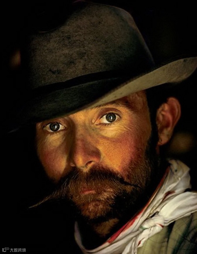 人像通常使用柔光拍摄,这样可以令模特放松,柔化纹理,并让模特的眼睛产生交流。在这张令人难忘的人像作品中,光线扮演了主角,将观众的视线引至牛仔的双眼,光线来自侧面,刚刚能够照亮牛仔的帽子,对高光区曝光,而非阴影区。