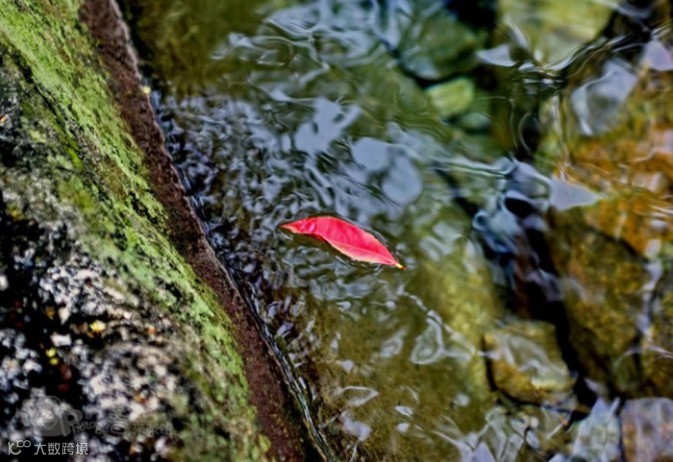在这张照片中,红色的树叶落于溪流之上,打破了画面的整体,虽然是落叶流水,但定格下的画面令人难忘。占据支配地位倒映着青绿色苔藓的流水中,红色起到了平衡的作用。
