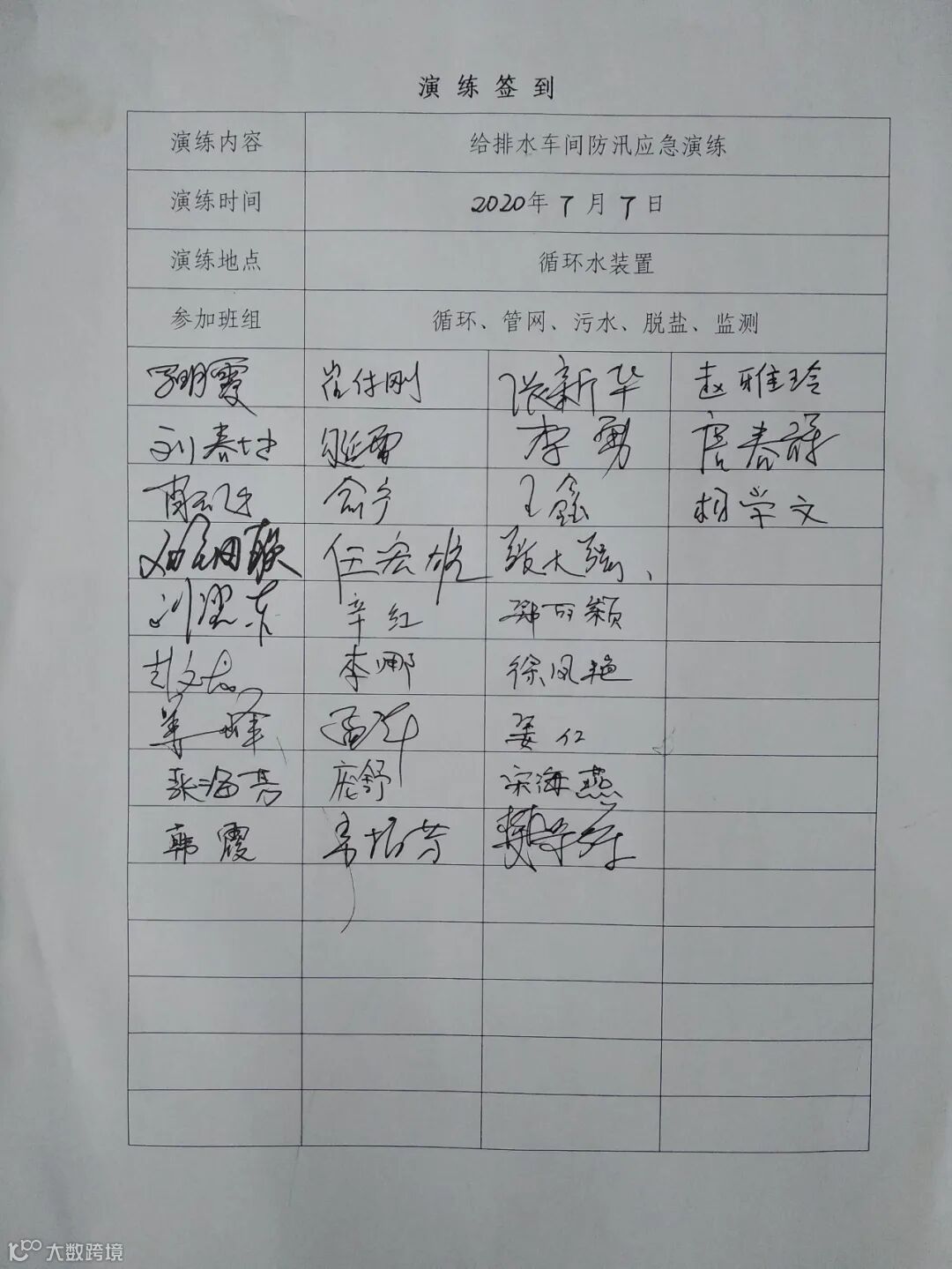 2020年7月7日13时30分,腈纶厂给排水车间在循环水站开展了一次洪汛灾害突发事件应急演练,车间各岗位员工共计30人参加了此次演练。