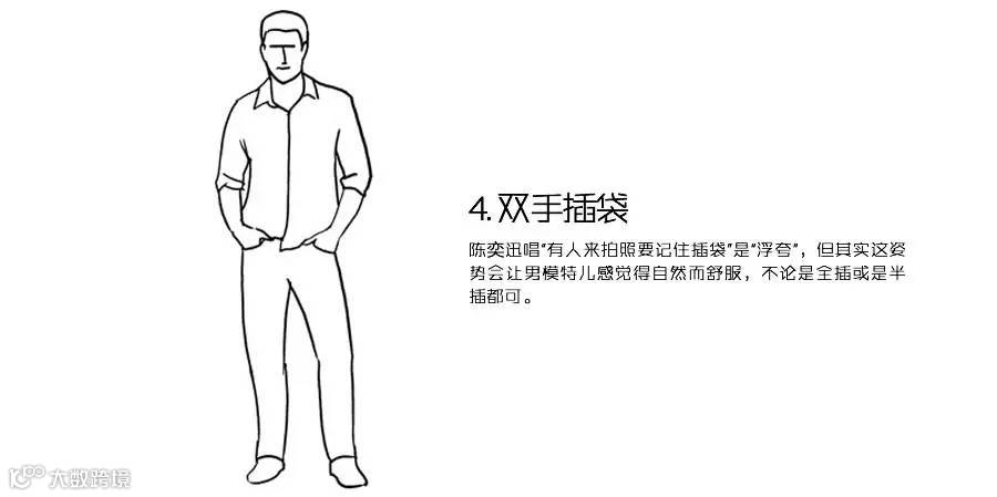 陈奕迅唱的“有人来拍照要记住插袋”是“浮夸”,但其实这姿势会让男模特儿感觉得自然而舒服,不论是全插或是半插都可。