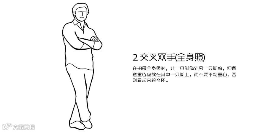 在拍摄全身照时让一隻脚绕到另一隻脚前,但留意重心应放在其中一隻脚上,而不要平均重心,否则看起来较奇怪。