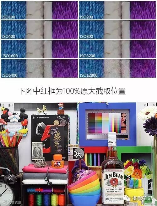 同时测试高感的时候,要测试画面中相对暗部的区域。在画面中,我截取的位置是被纸盒遮挡住的线轴。被遮挡住部分光线,是一个很好的测试区域。线轴也也容易看出细节和锐度的损失。