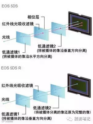 感光元件:5DS R取消了低通滤镜消除摩尔纹的功能;