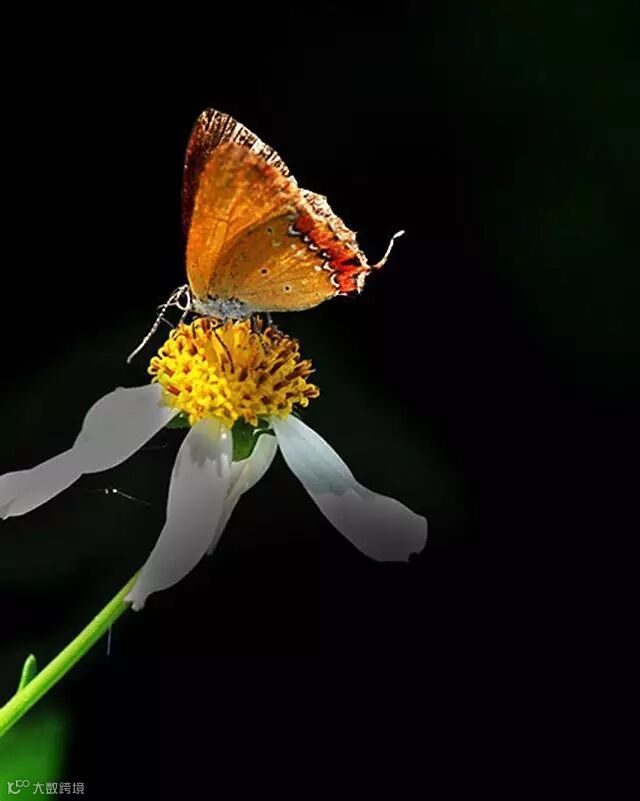 上图中,拍摄一只在咸丰草上小小的蝴蝶,利用光线的特性让主体和周遭环境有很大的明暗反差,蝴蝶有了光的照射便鲜活了起来,而光线照不到的杂乱背景则可让它曝光不足而隐藏起来,于是花上的蝴蝶就突显而出,尤其羽翼在逆光下呈半透明,更增添美感。