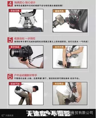 美国极速背带,拥有全球专利锁扣,可3秒快装、快拆、牢固可靠,快速拆卸直接装脚架,在户外拍摄中,让您快速、安全有效的抓拍精彩瞬间!