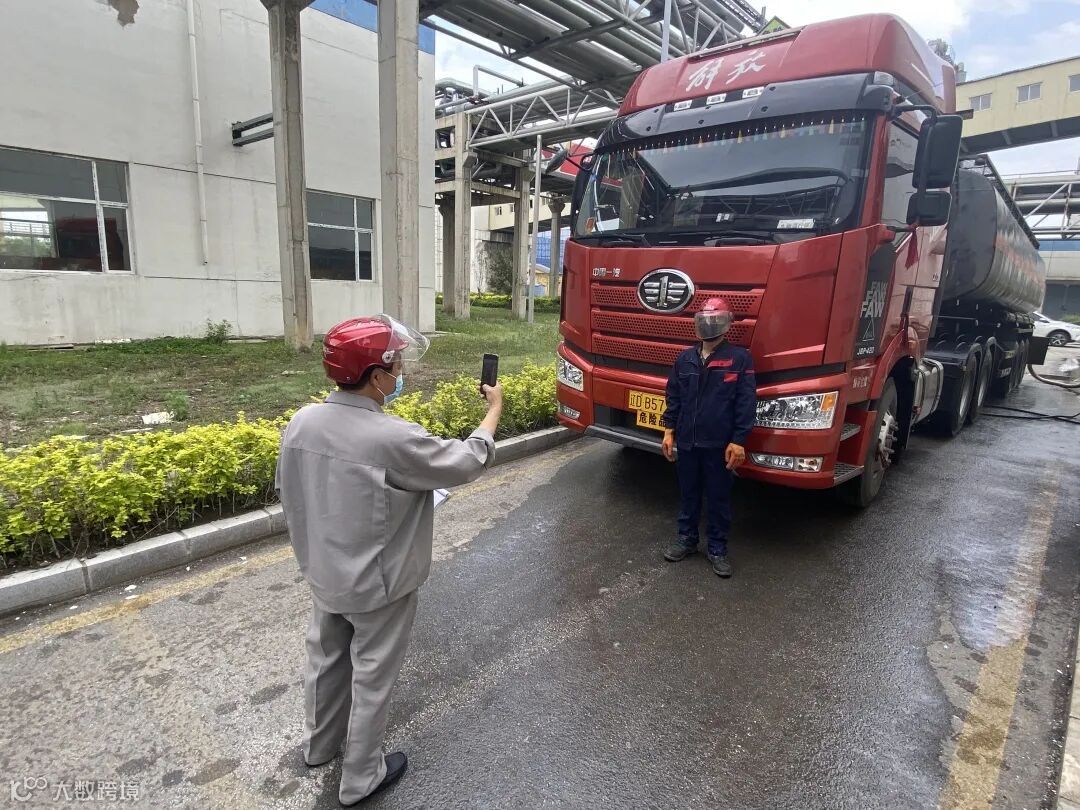 每次接待外来药剂厂家车辆,化学车间卸药班班长孙胜山都要对进厂卸车的司机进行体温检测和防疫安全教育。