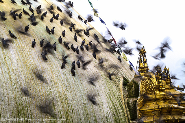 “这是一个不错的佛塔,这群鸟也不错”,拍下第一张,“这群鸟挺无聊的,他们没什么运动,也许曝光时进行变焦会好些”