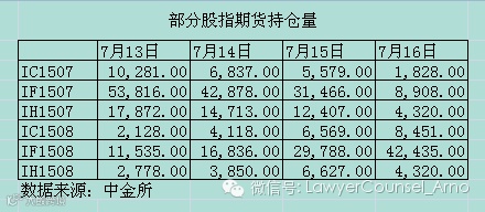 先来看组数据。从本周一到周四,上述3种合约的持仓量一直在下降。7月16日的持仓量分别为IC1507:1828手,IF1507:8908手,IH1507:4320,比周一大幅下降,周一分别为10281手、53816手、17872手。(参见表格)