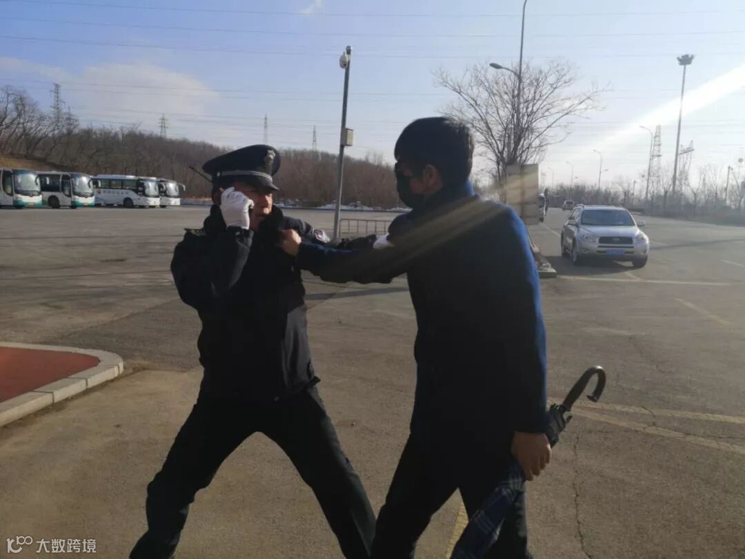 ”别动!别动!不许动!“应急小组人员迅速持防暴盾牌、防暴叉和警棍对两名暴恐人员进行格斗,全力将暴恐人员制服后押解上警车交送石化分局,成功完成抓歹徒行动任务。