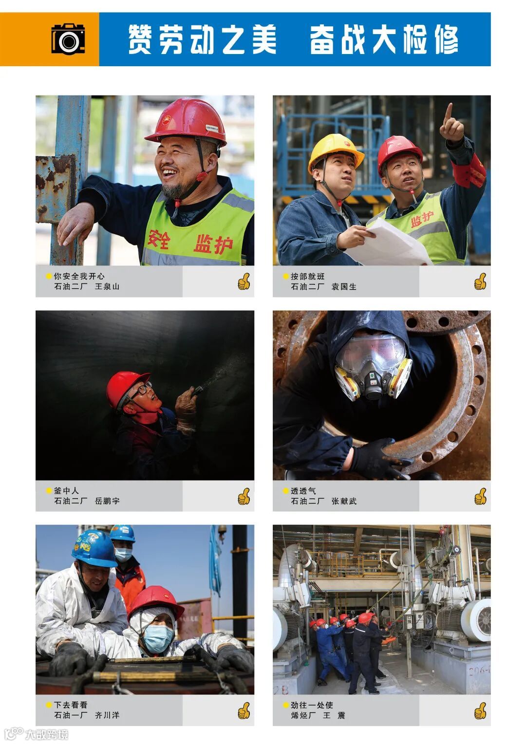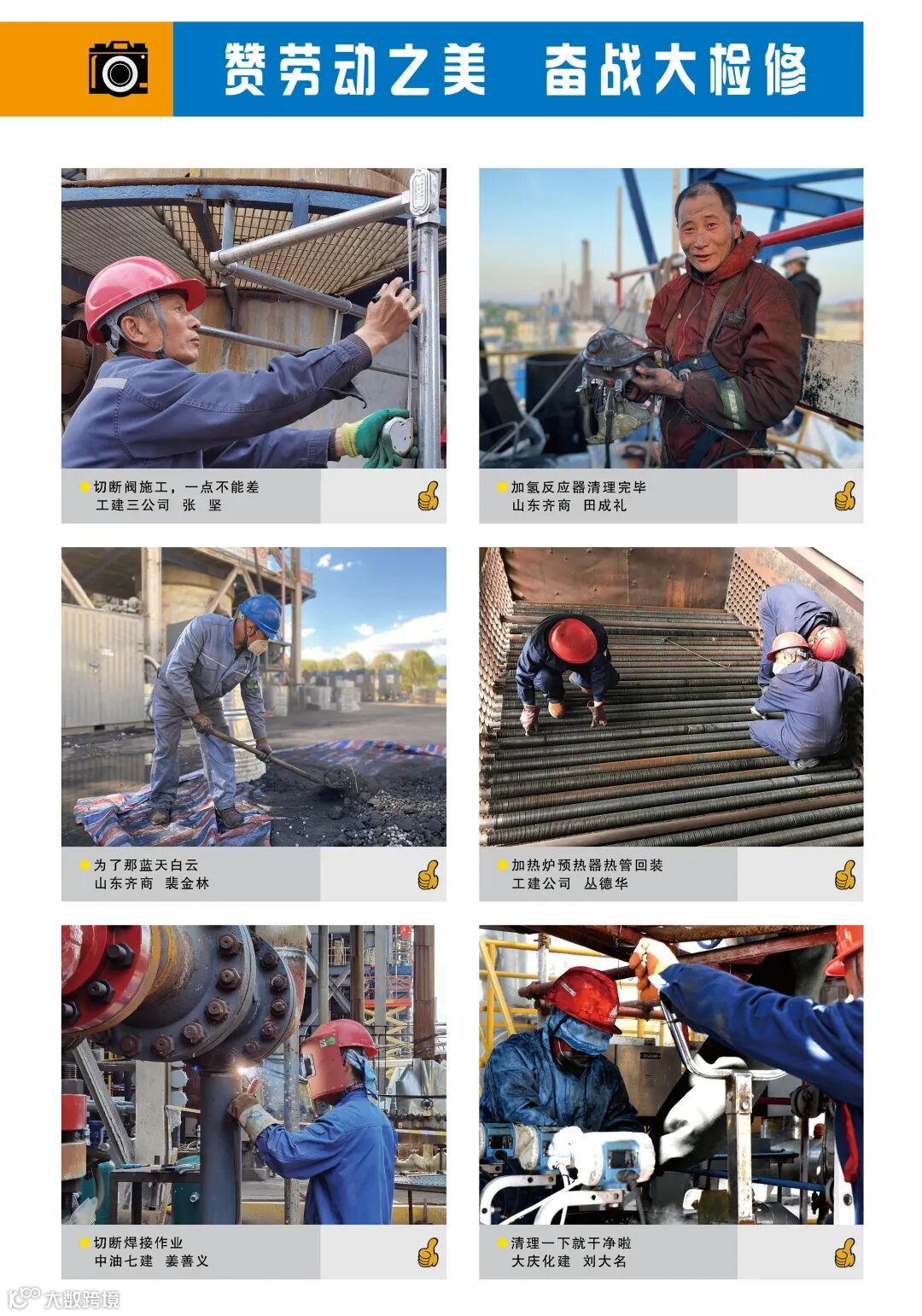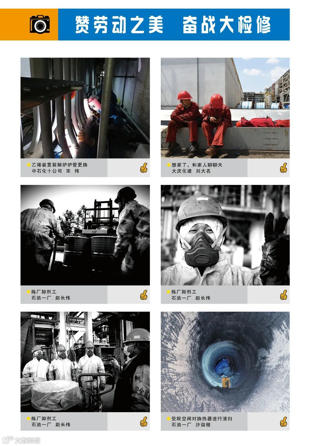 随手拍共征集341幅作品,经主办单位和相关处室认真筛选,择优118幅作品入围参展。并对最喜欢的作品进行点赞和评选,评出最受欢迎作品奖、最具人气作品奖、最有特质作品奖以及入围参展作品奖。现将优秀作品进行网络展出。再次展现广大一线检修人员专心专注投入装置大检修的“专、脏、苦、累、险、勤、乐”的真实瞬间,精准呈现外部施工单位“舍小家、顾大家”全心投身公司装置大检修的感人画面。