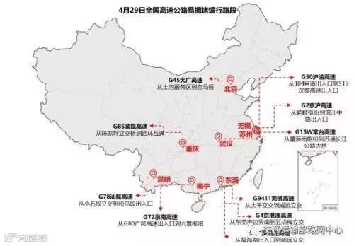 假期高速路小客车通行的免费时间为4月29日00:00-5月1日24:00,免费对象为7座以下(含7座)载客车辆以及允许在普通收费公路行驶的摩托车。预计拥堵路段如下图: