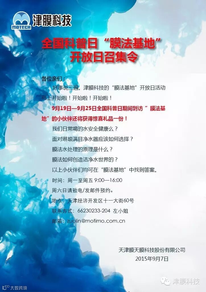 导读:各位亲们: 好事说三遍。津膜科技的“膜法基地”开放日活动马上开始啦!开始啦!开始啦!9月19