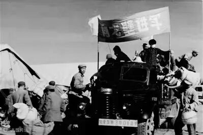 ▲一九五八年,建设者们挺进戈壁,建设靶场