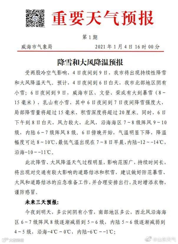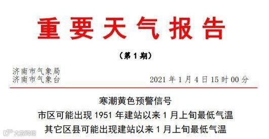 鉴于此次寒潮过程降温剧烈、气温低,为此济南市气象台于4日15时00分发布寒潮黄色预警信号。