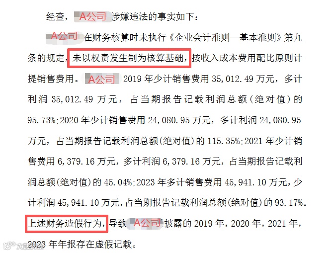 2019-2021年,A公司通过少计销售费用累计虚增利润6.5亿元,2023年反向多计销售费用虚减利润4.59亿元,在财务核算时未执行《企业会计准则—基本准则》第九条的规定,未以权责发生制为核算基础,按收入成本费用配比原则计提销售费用,导致4年年报虚假记载。