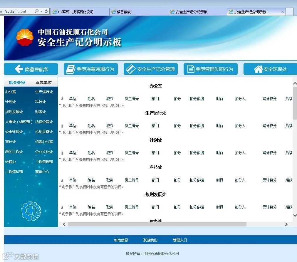 根据集团有限公司《全员安全生产记分管理办法》和股份有限公司《企业全员安全生产记分管理办法》要求,抚顺石化公司信息管理部与公司安全环保处立即进行广泛调研和征求意见,为了响应集团公司号召,决定由信息管理部自主研发安全生产记分管理系统。该系统从收到开发需求到正式上线仅用了半个月时间,期间正值十一国庆假期,系统开发人员放弃国庆假期,加班加点,于十月中旬将系统正式开发完毕。