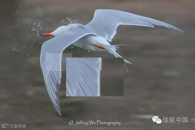 燕鸥出水后会把头拧转360度抖动并甩掉身上的水分,现在把局部放大,注意方框里燕鸥细羽的细节与纹理。这片子的对焦准确性和画质是完全可以接受的。