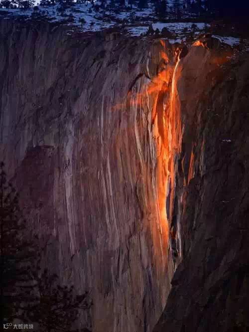 这可不是岩浆,而是埃尔卡皮坦的约塞米蒂国家公园的季节性瀑布,只能看到在2月份的时候看到,原理是如水恰如其分地反射了太阳的橙色光。