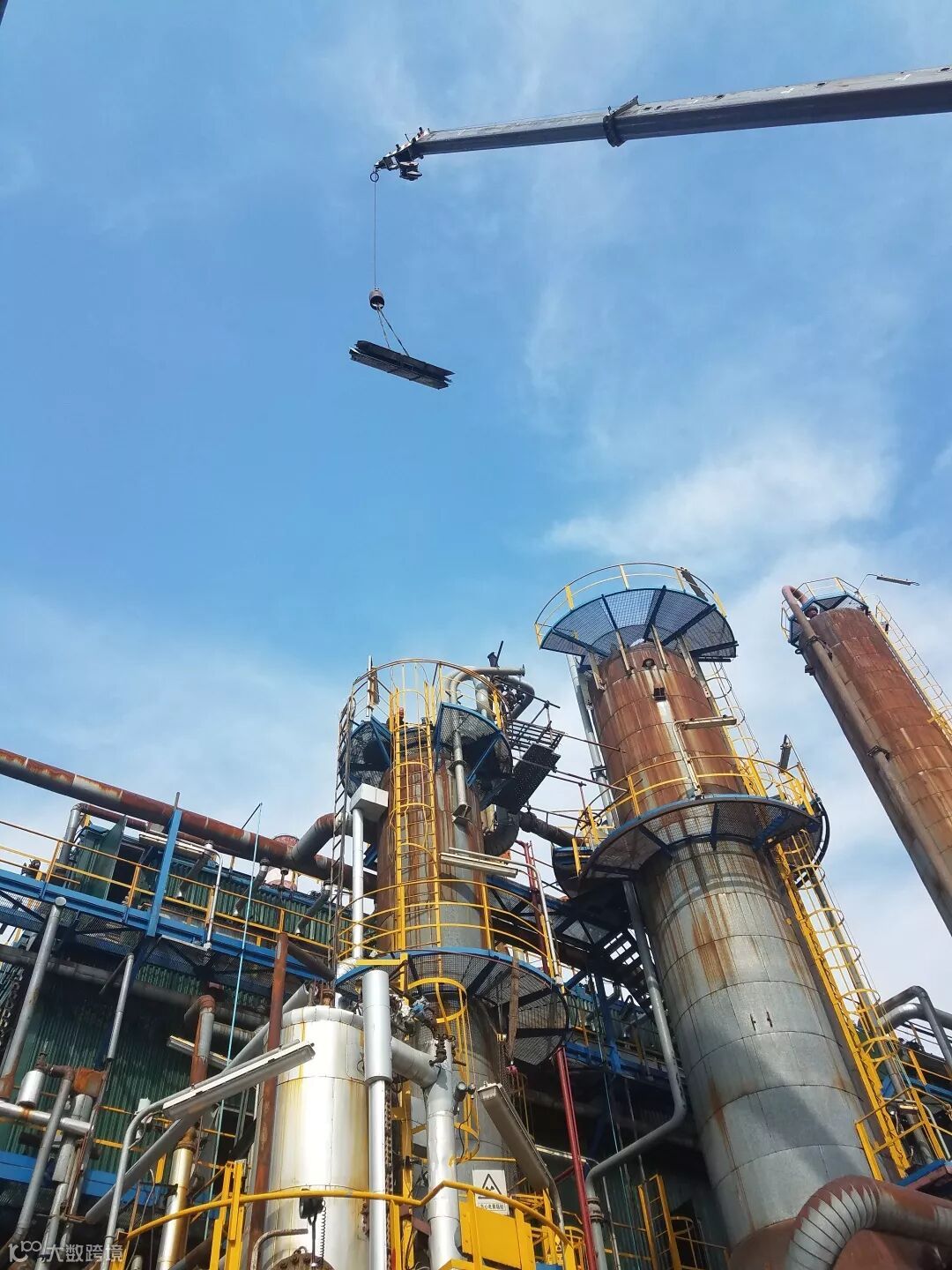 27日晚,施工人员开始拆卸C203塔底部再沸器,以形成上下对流通风,降低塔内的酸气。由于固定再沸器管束的折流板结焦增厚,再沸器抽到三分之一时,便紧紧卡在管箱口无法动弹。施工人员根据实际情况,反复核算吊装数据,最终决定加大拉力,在抽芯机的5吨拉力基础上,又增加了2组5吨倒链。28日凌晨2时18分,伴着“嘎吱嘎吱”的摩擦声响,硕大而沉重的再沸器终于全部移出,与管箱口脱离。