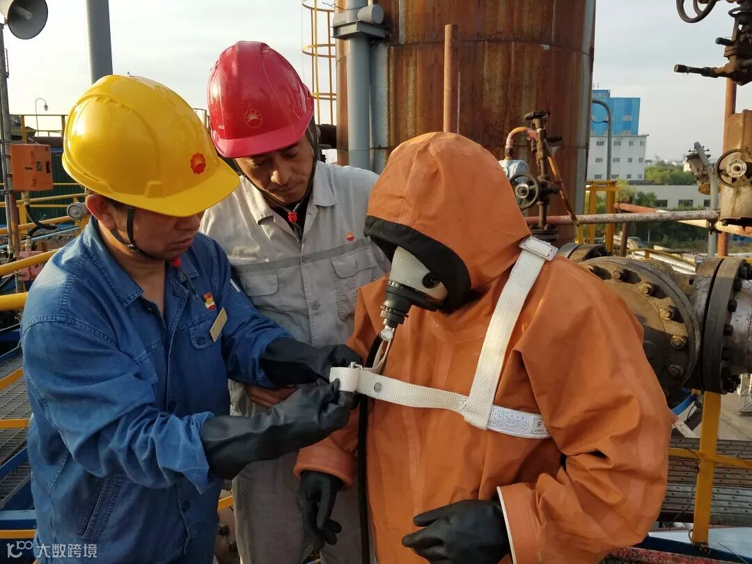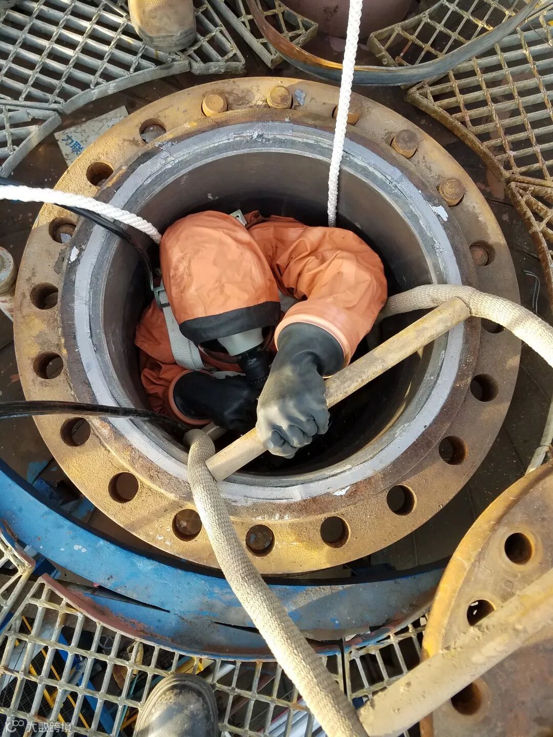 再沸器抽出后,加快了C203塔对流通风,虽然塔内具备了作业条件,但还是有残余的氢氟酸反应物。2名作业人员穿戴好防酸服与呼吸器,在安全人员的监护和帮助下,顺着云梯进入塔内。