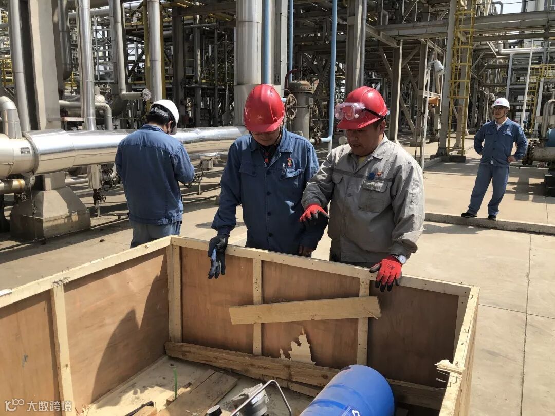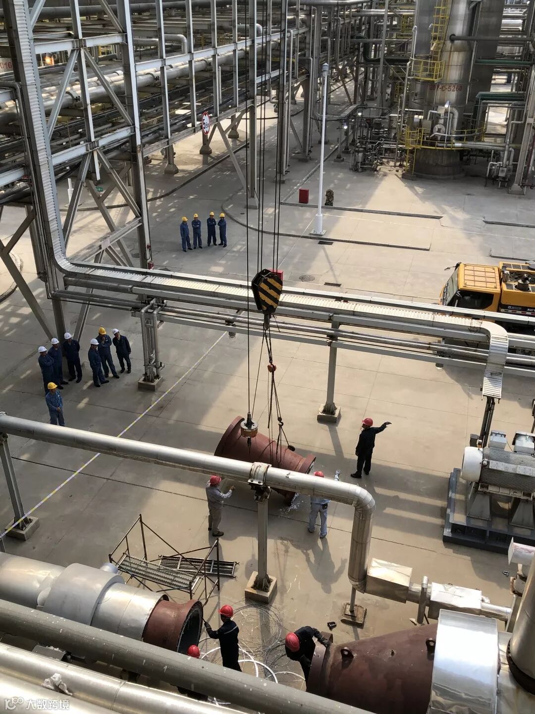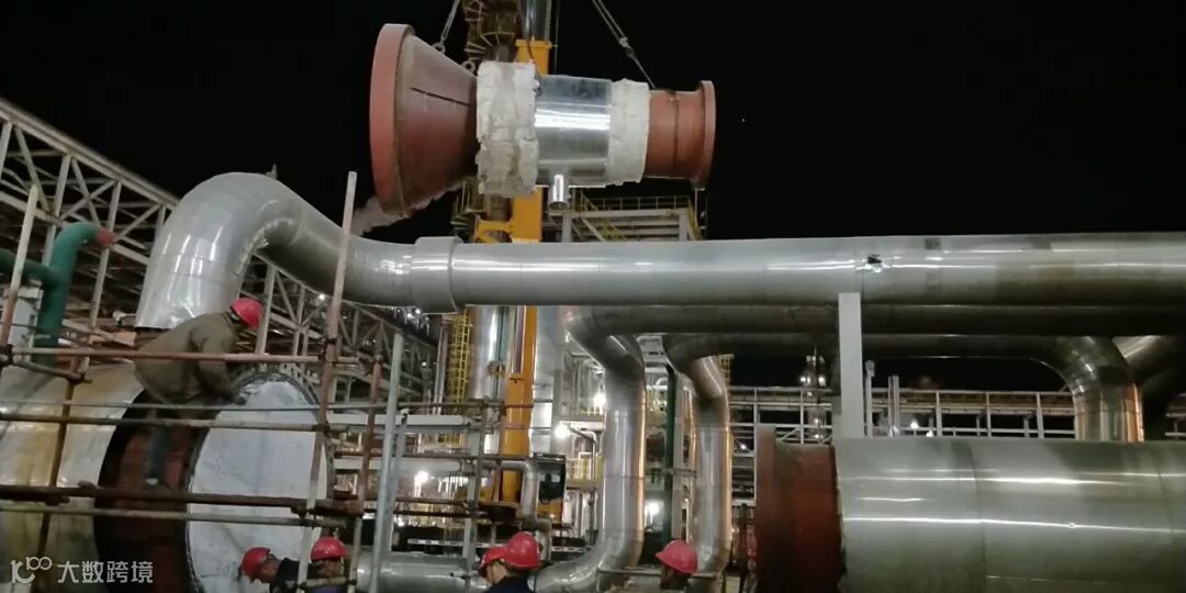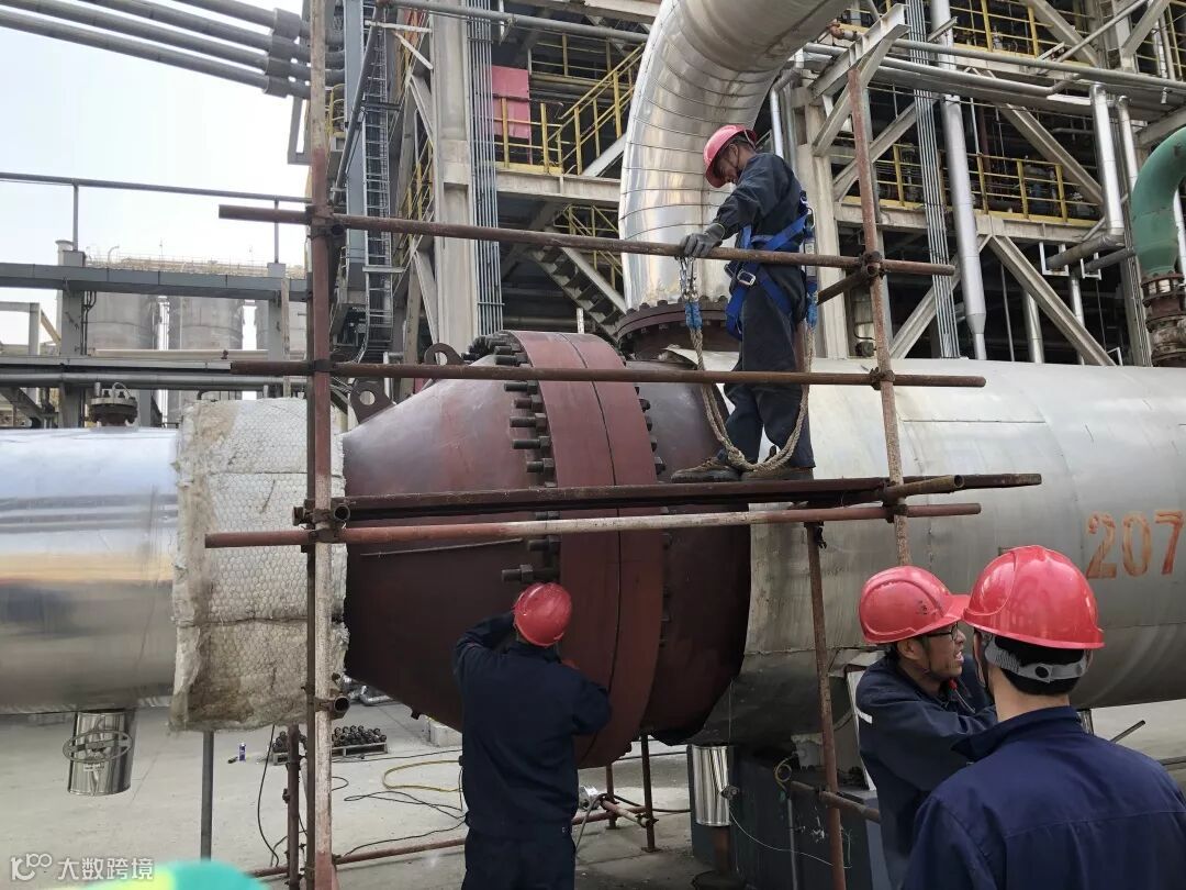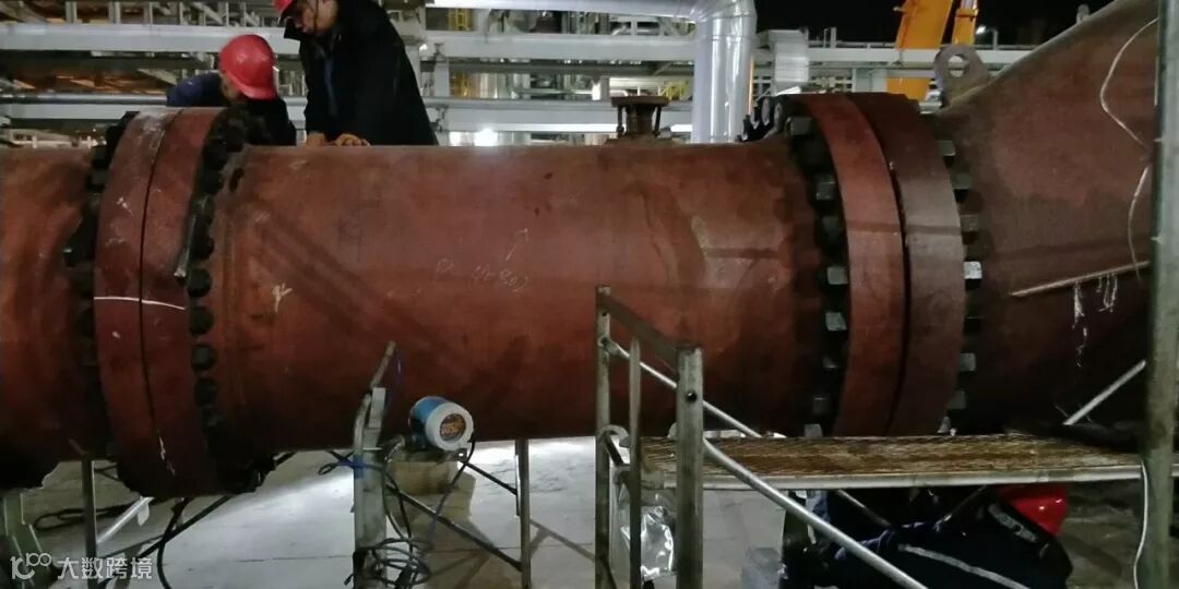 凌晨2点,夜班员工坚守岗位,携手工建队伍吊装换热器E-4002南侧短节完毕。历时2小时复位北侧短节吊装,拧紧螺栓,同时完成换热器的封头复位。