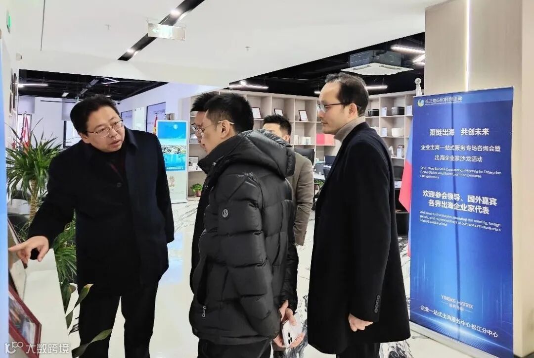 交流结束后,双方在服务中心背景板前合影留念,记录下这一重要时刻。镜头前,双方代表面带笑容,展现出对未来合作的美好期待。