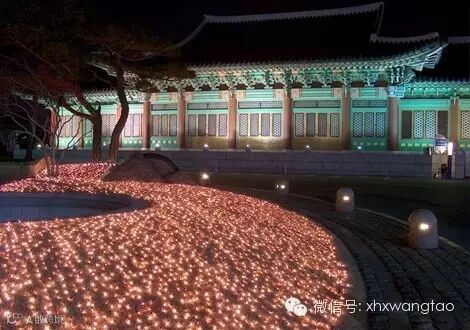 地毯灯不仅是好看的前景元素,它还构成引导观赏者看向拍摄主体(传统的韩式建筑)的“曲线”。