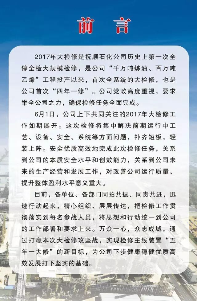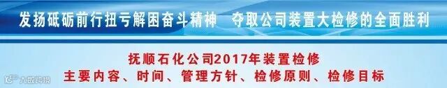 6月1日,公司上下共同关注的2017年大检修工作如期展开。这次检修是抚顺石化公司历史上第一次全停全检大规模检修,是公司“千万吨炼油、百万吨乙烯”工程投产以来,首次全系统的大检修,也是公司首次“四年一修”。在检修开始之际,公司先期制作了《发扬砥砺前行扭亏解困奋斗精神 夺取公司装置大检修的全面胜利》2017年大检修展板。将2017年装置大检修的意义目的、主要内容、时间、管理方针、检修原则、检修目标及各厂装置大检修停开工网络图和各单位检修风采以图文并茂形式绘制的清楚明晰,直观准确、简明易懂地反映出与生产相呼应的检修时间走势图,使广大干部员工对工作安排一目了然。