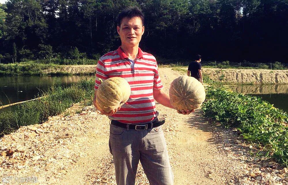 村民都是自己种菜吃,所以村里没有蔬菜销售店。扶贫组要吃菜就得去镇上买,路途太远,买多了就放烂了,买少了天天去,很耽误时间,后来开挖了鱼塘,岸边上有了一小块空地,扶贫组就开荒种上了菜。收获了2颗“南泥湾牌南瓜”,李永红高兴地让魏斌给他拍个照做纪念。
