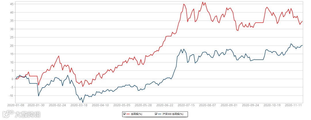 粤投研积极型基金组合累计上涨34.57%,同期沪深300指数上涨20.21%。2020年1月9日-2020年11月20日,数据来源:Wind。