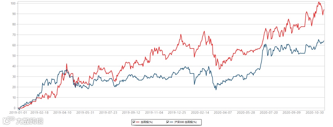 粤投研稳健价值模拟组合累计上涨93.97%,同期沪深300指数上涨64.19%。2019年1月1日-2020年11月20日,数据来源:Wind。