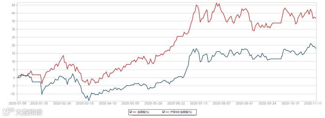 粤投研积极型基金组合累计上涨36.82%,同期沪深300指数上涨18.11%。2020年1月9日-2020年11月13日,数据来源:Wind。