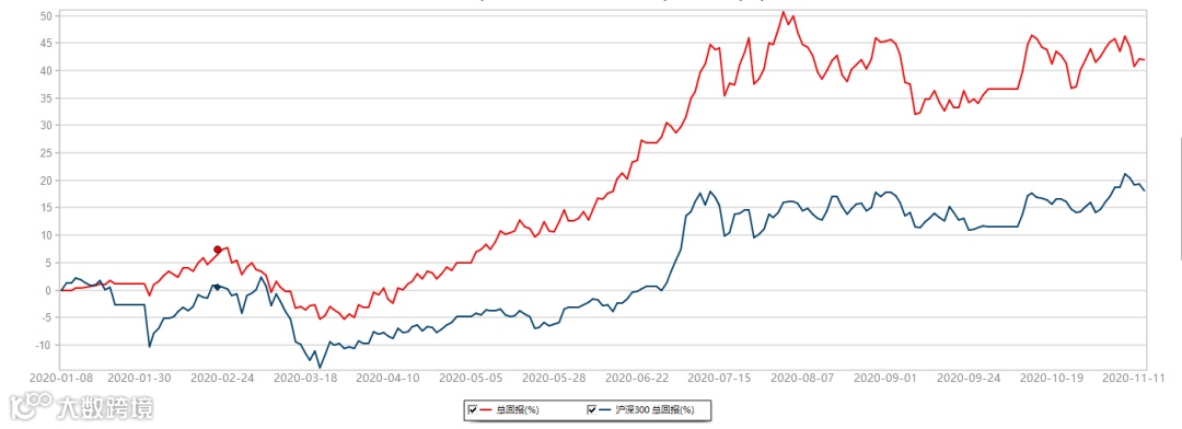 粤投研激进型基金组合累计上涨42%,同期沪深300指数上涨18.11%。2020年1月9日-2020年11月13日,数据来源:Wind。