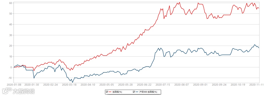 粤投研稳健型基金组合累计上涨55.22%,同期沪深300指数上涨18.11%。2020年1月9日-2020年11月13日,数据来源:Wind。