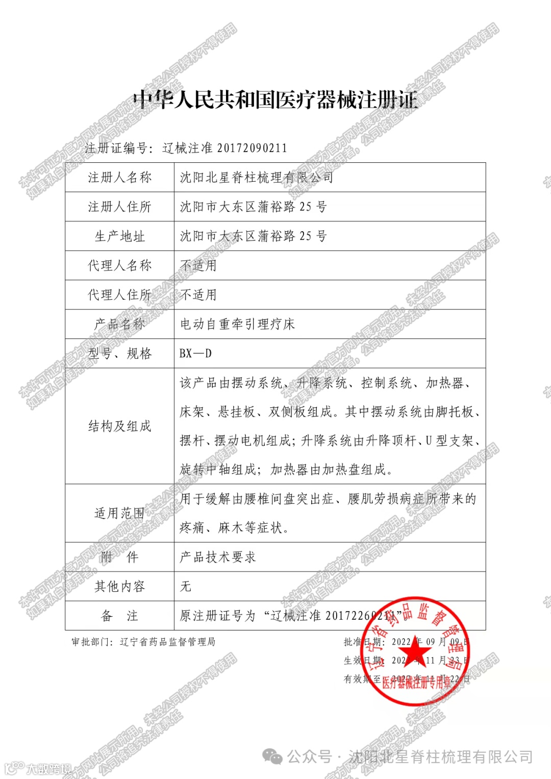BX-D型电动自重牵引理疗床注册为国家准字号二类医疗器械,用于缓解由腰椎间盘突出症、腰肌劳损病症所带来的疼痛、麻木等症状。