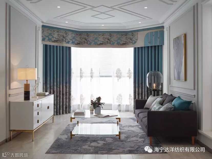 蓝色的墙布作为背景墙材料,