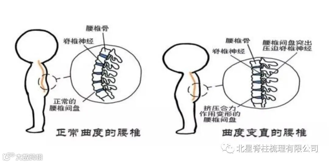 引起脊柱生理曲度变化的因素很多,在排除外伤、先天发育畸形等因素后,我们发现最主要的因素就是椎间盘形态与功能的改变。由于椎间盘形态与功能决定了相邻两块椎骨之间的距离与连接的稳定,多个椎间盘变性,就导致一整段脊柱的高度和形态变化,最明显和最早出现的病理变化就是高度的改变和中正度改变,进而也会导致生理曲度改变。