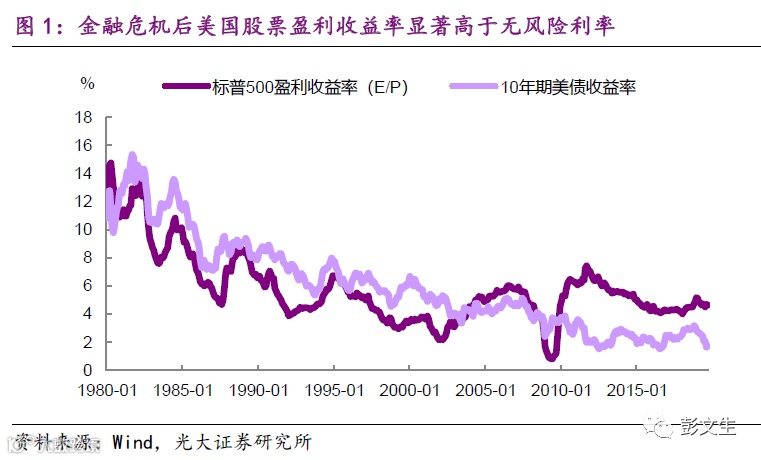 我想先提出两个有意思的观察或者说问题。第一、过去40年美国10年期国债收益率呈趋势性下行,但与股票盈利收益率的关系在前20年与后20年明显不同。1980-90年代长期利率和标普500盈利收益率都持续下降,前者略高,近20年利率继续下行而股票收益率稳中缓升,金融危机以后分化尤其加大, 股票收益率明显高于利率(图1)。按照历史关系,当前利率水平对应的股价应该更高。怎样解释这种分化所隐含的资产配置逻辑,背后又折射怎样的宏观经济关系?