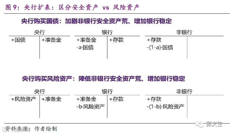 第三个维度涉及央行扩表的影响,要区分安全资产和风险资产(图9)。央行购买国债或风险资产一部分可能来自银行本身一部分来自非银行部门,但都是通过银行(因为只有银行在央行有交易账户)进行,导致银行在央行的准备金增加,安全资产增加(源自非银行部门通过银行卖出的国债),银行稳定性改善。