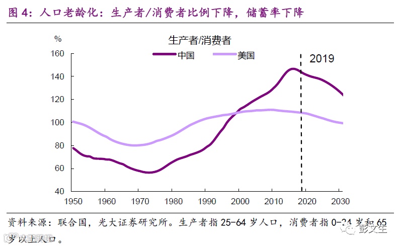 那么如何看导致停滞的基本面因素?一个解释就是主要经济体人口老龄化。年轻人越来越少,资本回报率下降,从而导致投资的需求下降,利率下行(图3)。但另一方面,人口红利的拐点已经发生,储蓄率下降,对利率有抬升作用(图4)。有观点认为利率会随着老龄化加剧继续下行,这值得商榷,我们要关注老龄化对利率两个相反方向的影响,老龄化不应该是未来导致低利率的主要因素。另一个解释就是技术进步。未来最需要关注的是数字经济,数字经济有助于提高效率,增加供给,但供给的分配是不平衡的,赢者通吃会加大贫富差距,由此导致需求相对供给不足,自然利率下降。