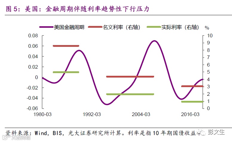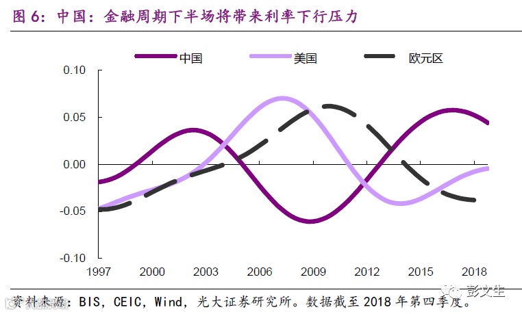过去40年,美国有三次金融周期的上升阶段,每一次上升阶段的利率中位水平都比前一次更低(图5)。因为货币政策追求的供求平衡以温和通胀为导向,而通胀都不是大问题,所以货币政策偏松,利率偏低。到了金融周期下半场,去杠杆、资产泡沫破裂,利率下行压力更大。这导致利率呈现跨周期的趋势下行。现在大家担心美国可能要进入负利率,我认为关键不是看传统经济周期,而是要看美国多快进入金融周期下半场。中国已经进入金融周期下半场调整,未来几年去杠杆和房地产调整将带来利率下行压力(图6)。