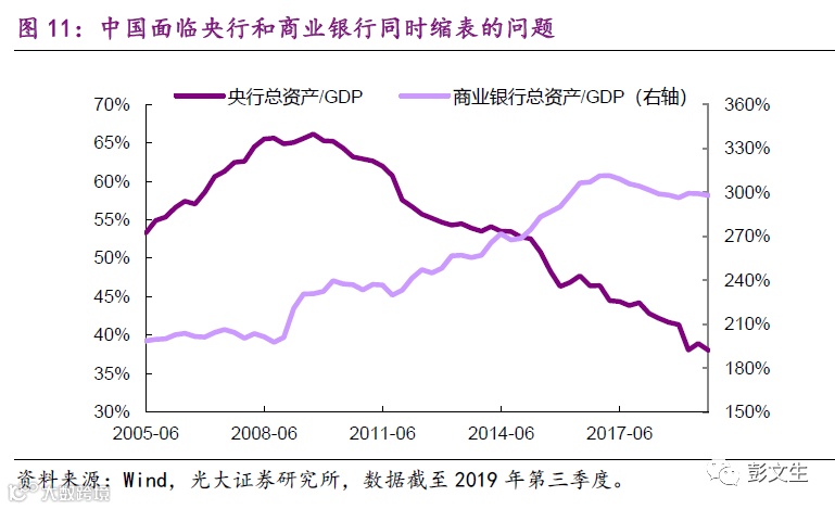 其次,央行作为公共政策部门,其行为本身就可以带有财政属性,而财政不仅有总量更有结构维度,新形势下货币政策需要结合总量和结构考虑,一个值得关注的问题就是央行扩表的必要性和方式。过去10年央行在缩表,安全资产供给减少,但这被商业银行和影子扩表提供的准安全资产抵消,后者带来金融风险,难以持续。2017年以来央行和商业银行都在缩表,安全资产(央行提供)和准安全资产(银行提供)相对于经济规模都在下降,这是中国经济面临的一个重要问题(图11)。