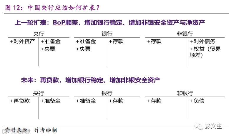央行购买风险资产是准财政行为,直接作用于私人部门,降低私人部门安全资产荒。所以,就稳定经济的效果而言,央行扩表应该通过增持风险资产,美联储购买MBS、欧央行再贷款和中国央行发放PSL,都是准财政行为。